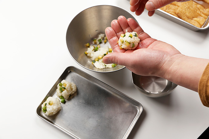 Mix 6–7 g of ready-fried onion, 12–13 g of crushed almonds and 200 g of sushi rice, and use it to fill the inari-agé pockets.