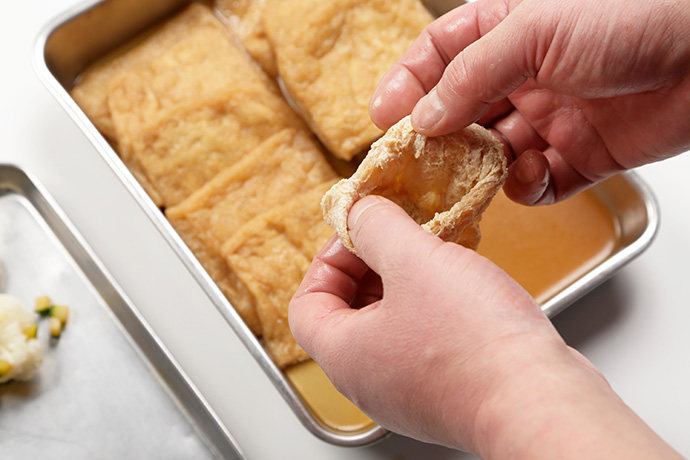 When the abura-agé, which is made from thinly cut pieces of tofu, is fried, it turns into something like a soft batter with air in the middle. This is then cut and opened up by hand to make a pocket. The pocket can then be filled with sushi rice and other fillings.