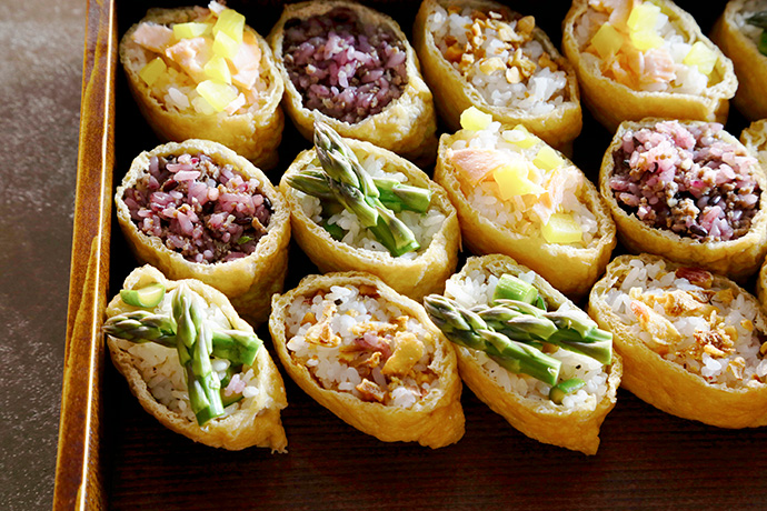There are plenty of ways to enjoy inari-zushi too. It all depends on your creativity. Seasonal ingredients can be used to capture the essence of the season. Substituting vinegar for lemon in the rice gives it the perfect summer taste, while carrots can be cut into leaf shapes and added for decoration in the fall. Part of inari-zushi's appeal is how easily it can be changed to suit the seasons. It can also be made vegan-friendly by using only plant-based ingredients.