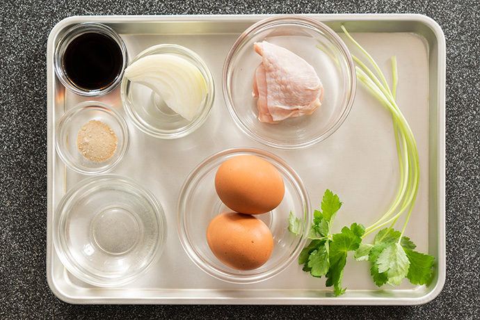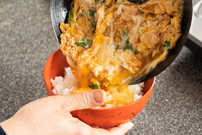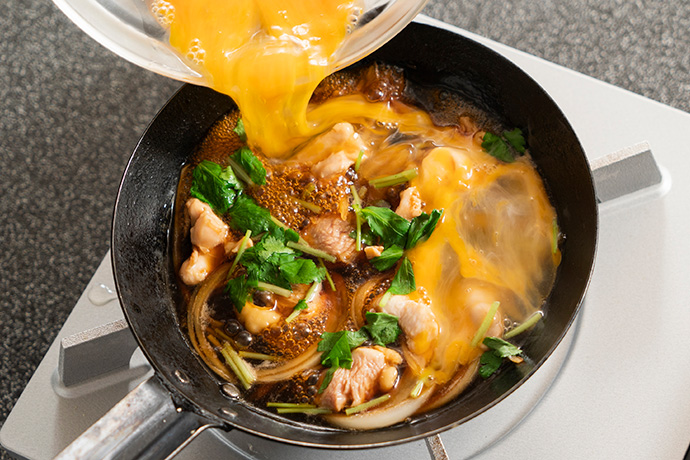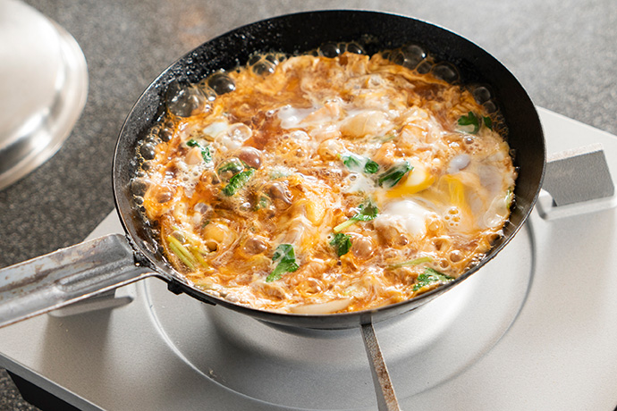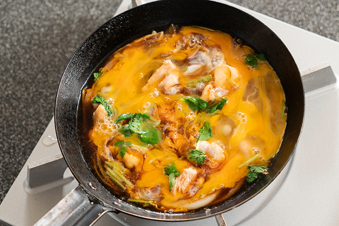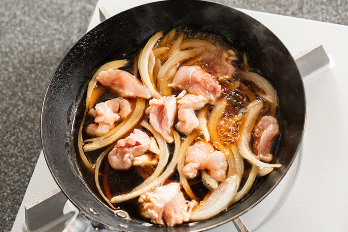 To make oyakodon, most people add both seasoning and dashi stock, but you actually don't need stock to get delicious flavors from the chicken. In Japan, serious oyakodon lovers use a special ladle-like pan called an "oyako-nabe" to make their oyakodon. But don't worry — a small frying pan is all you really need to get tasty results. One of the best things about oyakodon is that it's quick and easy to make.