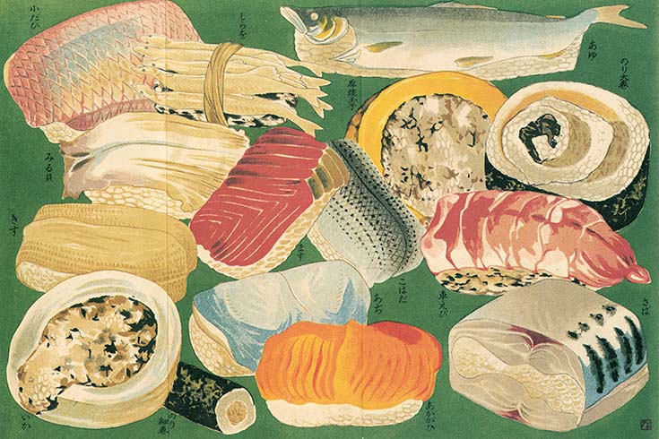 كان حجم السوشي في عصر إيدو ضعف أو ثلاثة أضعاف حجم السوشي في الوقت الحاضر. يصور هذا الرسم تشكيلة من السوشي فوقه سمك دنيس وسمك الثلج والشابل متوسط الحجم وسمك الأسقمري والجمبري والمحار الأحمر وكذلك سوشي مضغوط مع سمك ماكريل مخلل. (من مقتنيات متجر يوشينو سوشي الرئيسي).