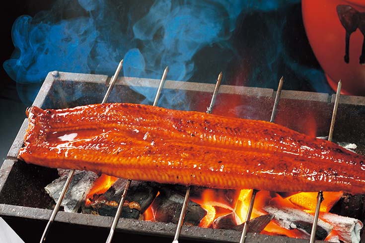 أوناغي أو سمك الثعبان مشويًا على طريقه «كاباياكي» بوضعه في أسياخ ثم غمسه في صلصة صويا حلوة مع الميرين قبل الشوي.