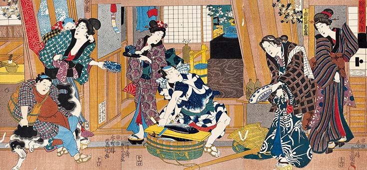 رجل يبيع أول حصيلة الموسم من سمك «كاتسوو». في ذلك العصر كان بائعو السمك يطرقون أبواب المنازل ليبيعوا بضاعتهم. (أوتاغاوا كونيسادا، أونوهانا – زوكي «الشهر الرابع من التقويم القمري») (من مقتنيات متحف الفنون سيكادو بونكو)
