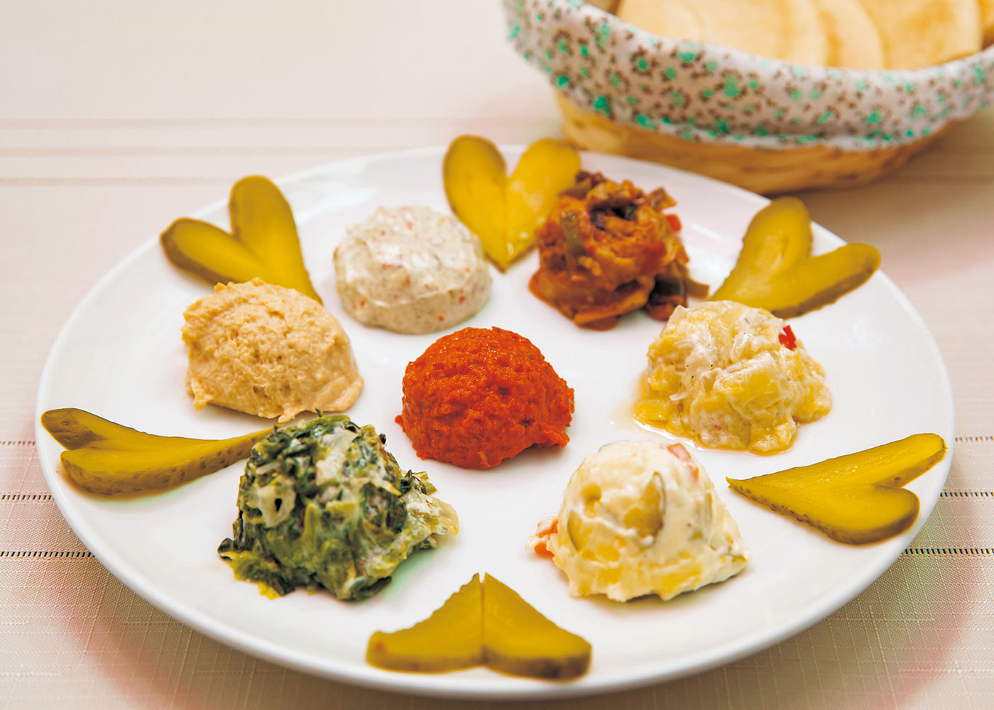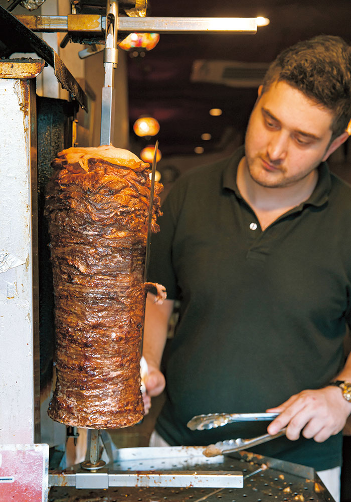 Turkish kebab is a dish of thinly sliced meat that is layered together, grilled over fire, then shaved, and served with salad in bread. There are numerous kebab stands in Okubo, but there is also a restaurant where customers can enjoy not only take-away kebab ①, but also a course of authentic Turkish dishes starting with appetizers of hummus and tzatziki to spread on a piece of pita bread ②. (HiSAR)