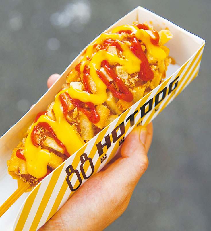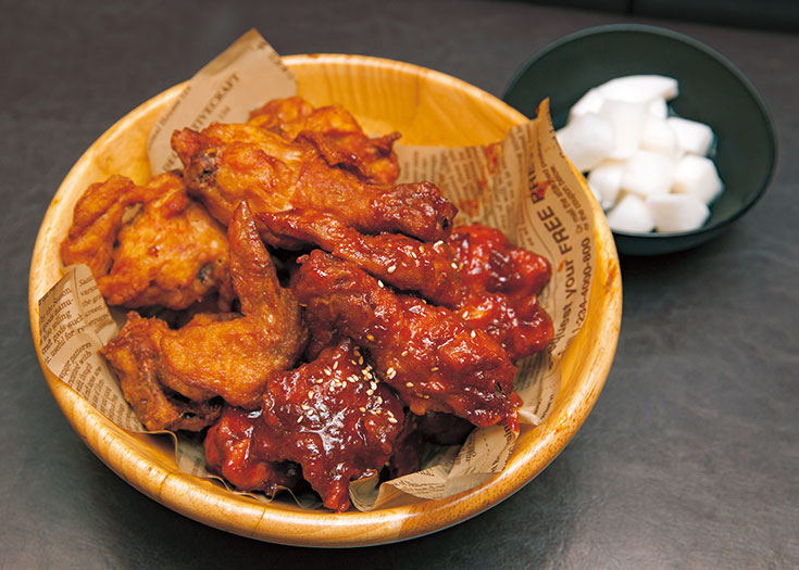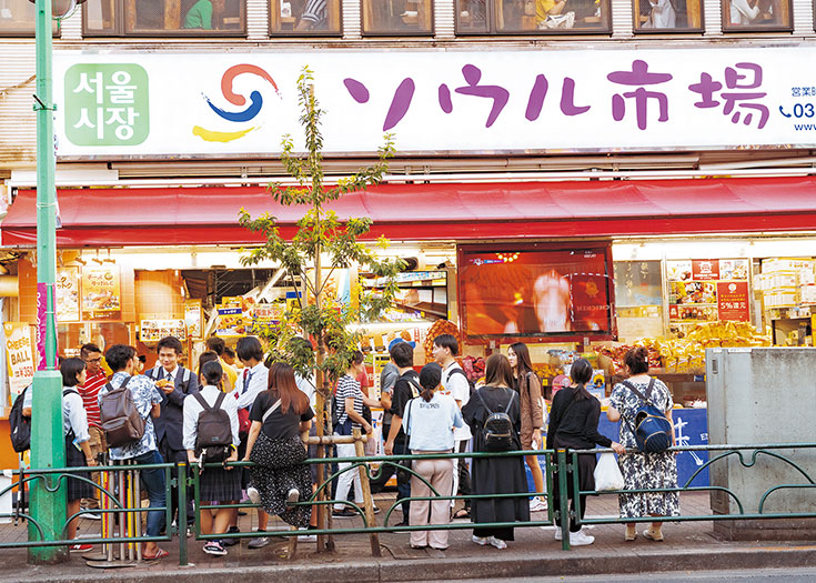 La base de la actual zona de Okubo, caracterizada por la presencia de diversas etnias, se estableció en los años 90 gracias a los restaurants coreanos. Hasta nuestros días, estos son los establecimientos de comida más comunes en el área. La comida coreana que se sirve aquí cuenta con una diversidad increíble, incluyendo los platos que en su día conformaron la cocina que se servía a la realeza coreana, hasta manjares propios de la comida casera. En los últimos años, también se ha producido una tendencia a ofrecer apetitosas nuevas comidas ligeras, que son especialmente populares entre las jóvenes japonesas. Estas incluyen postres de hielo raspado endulzado, servidos con mango y queso cortado en forma de dados ①, así como el famoso perrito caliente de queso ②, que es queso ensartado en un palito envuelto en papas cortadas en cubitos y una masa de harina que se fríe en abundante aceite. Este supermercado vende todos esto manjares en un puesto especial, que atrae a largas filas de compradores que esperan su turno en frente del establecimiento ③. El pollo dulce y especiado con sabor de gochujang ④ parece que también se va a poner de moda. (1, 4 restaurante Hong Chun Cheon; 3 Seoul Ichiba)