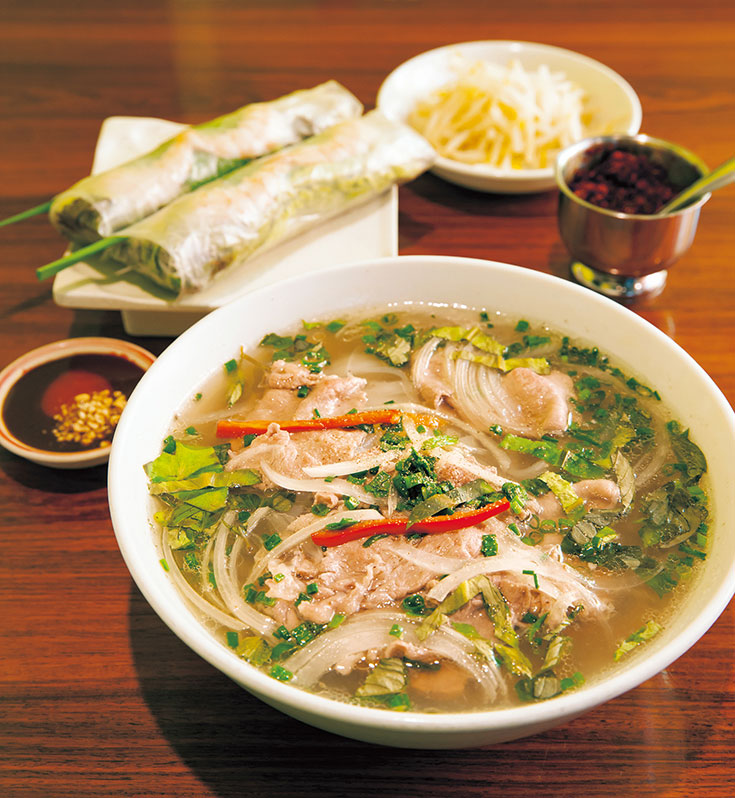 A medida que crecía el número de estudiantes extranjeros que asistían a academias de lengua japonesa y a escuelas de formación profesional, también se incrementó la cantidad de jóvenes vietnamitas que visitan Okubo. Los visitantes pueden disfrutar de una gama familiar de platos y delicias, tales como café con leche condensada ①, fideos de arroz phoy rollitos de primavera frescos ②. (Vietnam chan)