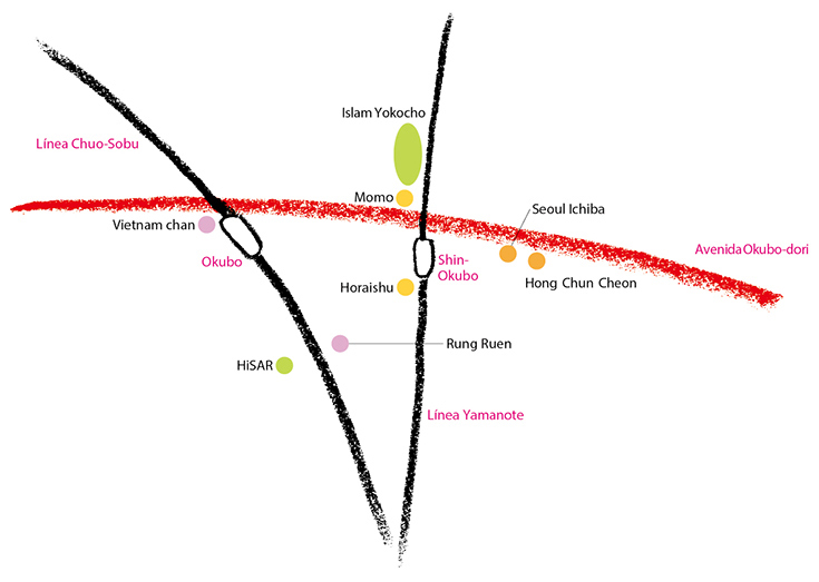 Okubo es una zona que se encuentra a lo largo de la avenida Okubo-dori, la calle que pasa por debajo de la Estación de Shin-Okubo de la Línea JR Yamanote y la Estación de Okubo de la Línea JR Chuo-Sobu. Personas procedentes de Corea, China, el Sudeste Asiático y el Oriente Medio se han establecido a vivir allí, creando una zona con sus propias características y transformando el área en uno de los distritos más variopintos de Tokio. Un excelente lugar para cualquier persona que quiera disfrutar de cualquier tipo de comida asiática en un ambiente informal, Okubo se ha convertido en un atractivo destino turístico.