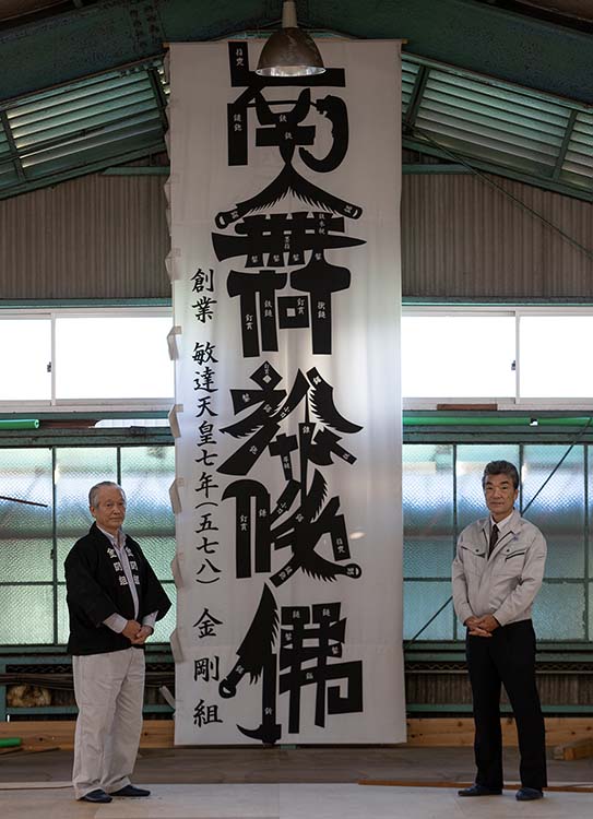 النجار القدير كوئيتشي شيغيو (في اليسار) مع توني كينيتشي رئيس شركة كونغو – غومي. وهذا العلم يسمى «بانشوكي» ومكتوب عليه «نامو أميدابوتسو» وهي ترنيمة بوذية (نيمبوتسو باليابانية). لو دققت في الصورة ستجد أن الحروف عبارة عن أدوات النجارة مرصوصة بحيث تصنع شكل الحرف، فتجد فأرة النجار أو المسحاج والأزميل والمنشار وغيرها.