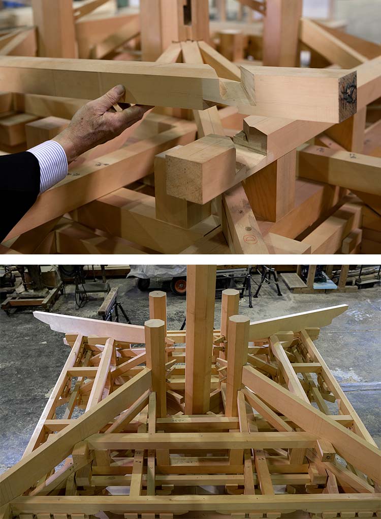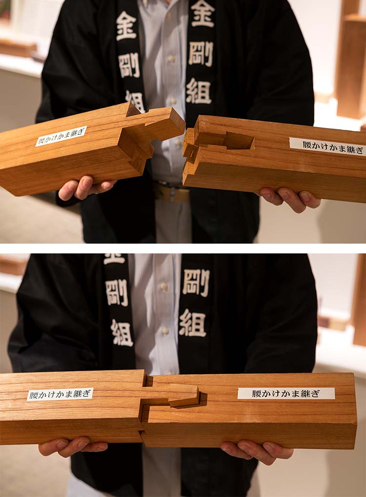 في الأعلى: يستخدم كوئيتشي هذه النماذج الخشبية ليوضح وصلة «تسوغيته»