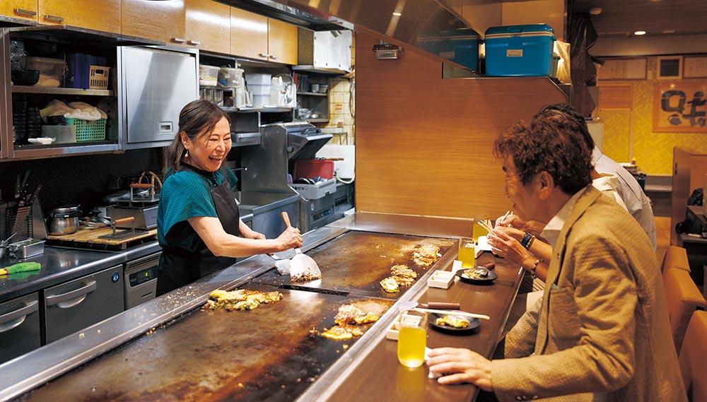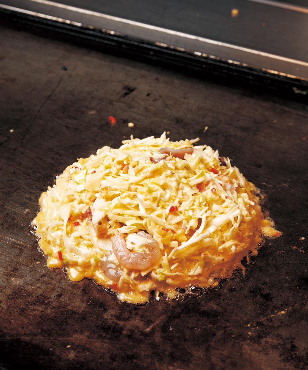 Okonomiyaki (front), negiyaki (middle), and ikayaki (right) are cooked on a griddle right in front of customers.