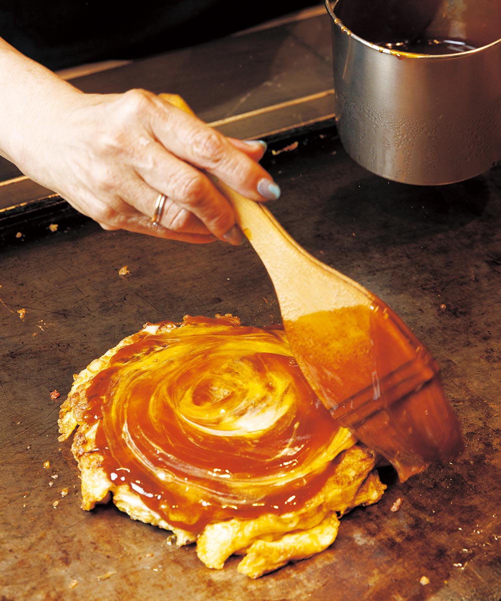 Made by adding ingredients such as meat or seafood into a batter of wheat flour and dashi broth along with ample amounts of shredded cabbage and grilling the mixture in flat, pancake-like forms, okonomiyaki is eaten with a salty-sweet sauce. Though there is some uncertainty, one prevailing theory is that it was first sold at street stands in the Kansai region around the time of the World War II. It is popular in-home cooking, made with favorite ingredients on hand, as well as at the numerous privately run eateries found in the city that specialize in the dish. Okonomiyaki is a food that the people of Osaka eat regularly in day-to-day life.