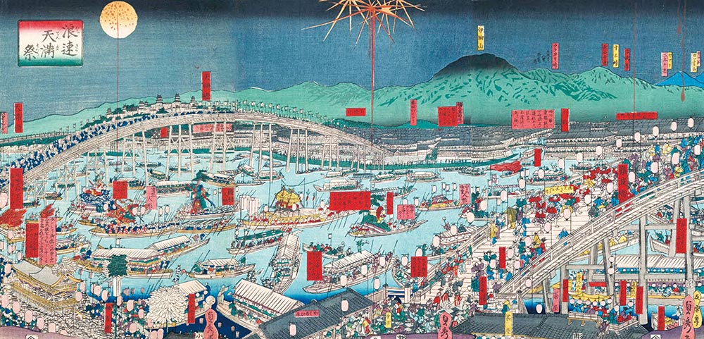 Naniwa Tenma Matsuri de l’artiste Utagawa Sadahide représente les rives animées d’Osaka pendant un festival à l’époque d’Edo. (Collection de la bibliothèque préfectorale de Nakanoshima, Osaka)