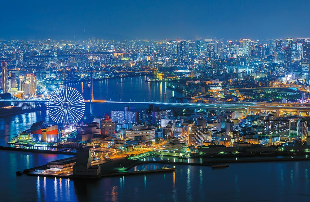 Vista noturna desde a Baía de Osaka. Os arranha-céus ao fundo ficam no centro da cidade Foto: PIXTA