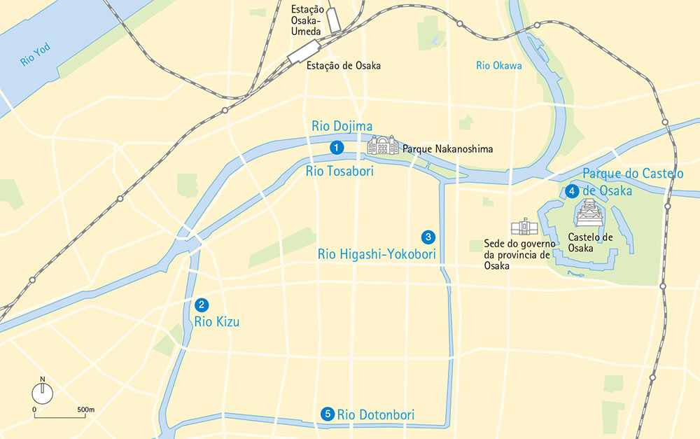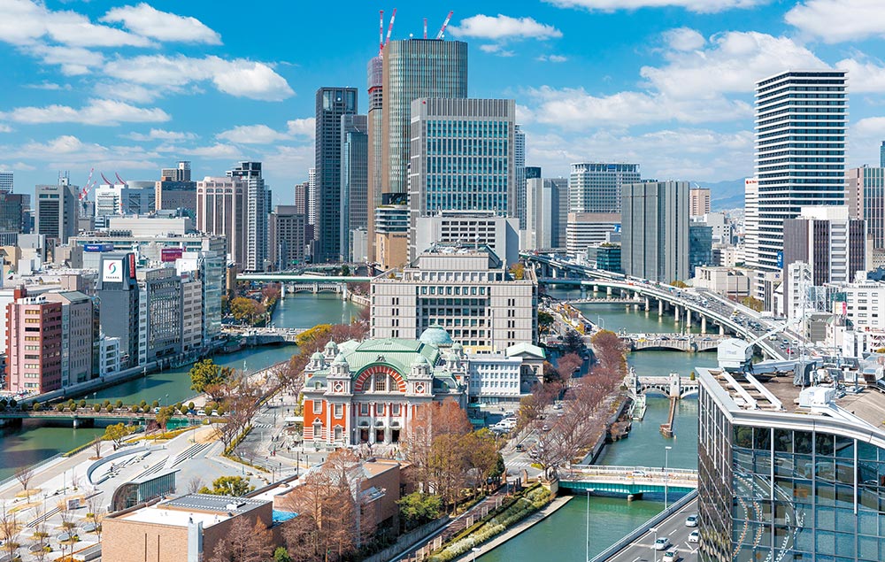 Os rios Dojima e Tosabori fluem ao longo do lado norte do centro da cidade. Correndo paralelamente entre si até além da Ilha Nakanoshima, que se estende por uns 3 quilômetros de leste a oeste, os rios se unem na extremidade oeste do centro. Há muito tempo um distrito comercial, a área de Nakanoshima é pontilhada de arranha-céus, que desempenham papel econômico essencial, e prédios históricos. (Foto: Aqua Metropolis Osaka Consortium)