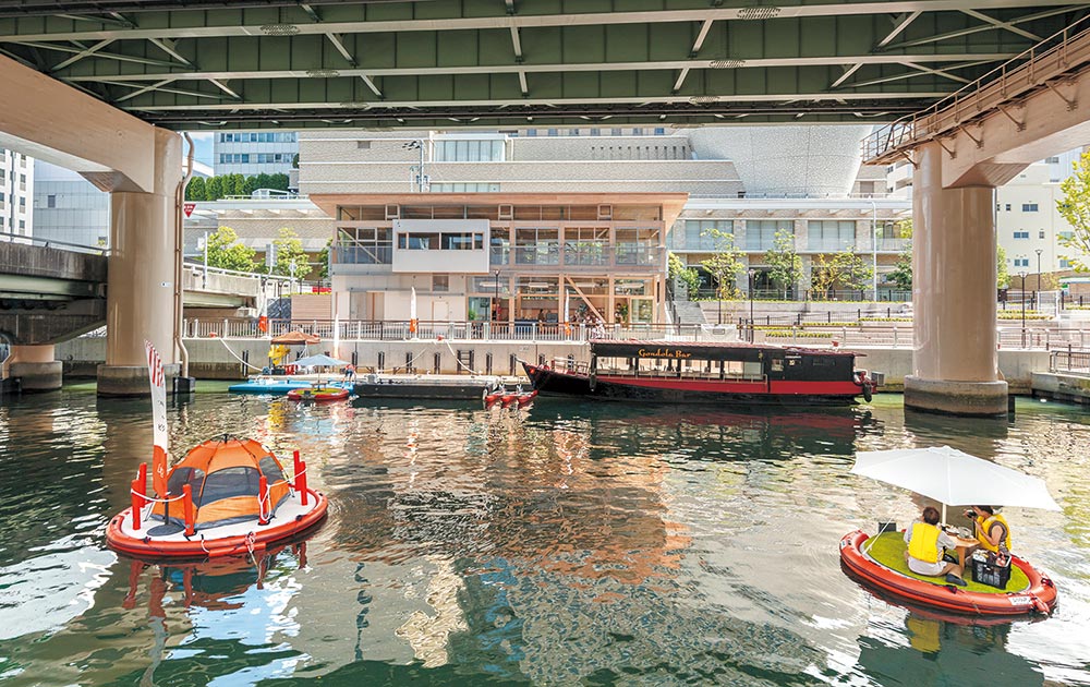 A leste está a mais antiga via fluvial de Osaka, o Rio Higashi-Yokobori, que foi canalizado há cerca de 400 anos. Hoje, é uma popular área de entretenimento, onde o público desfruta atividades de lazer ao longo do curso d’água, tirando proveito do vão coberto debaixo da elevada da Via Expressa Hanshin. (Foto: ßHONMACHIBASHI)
