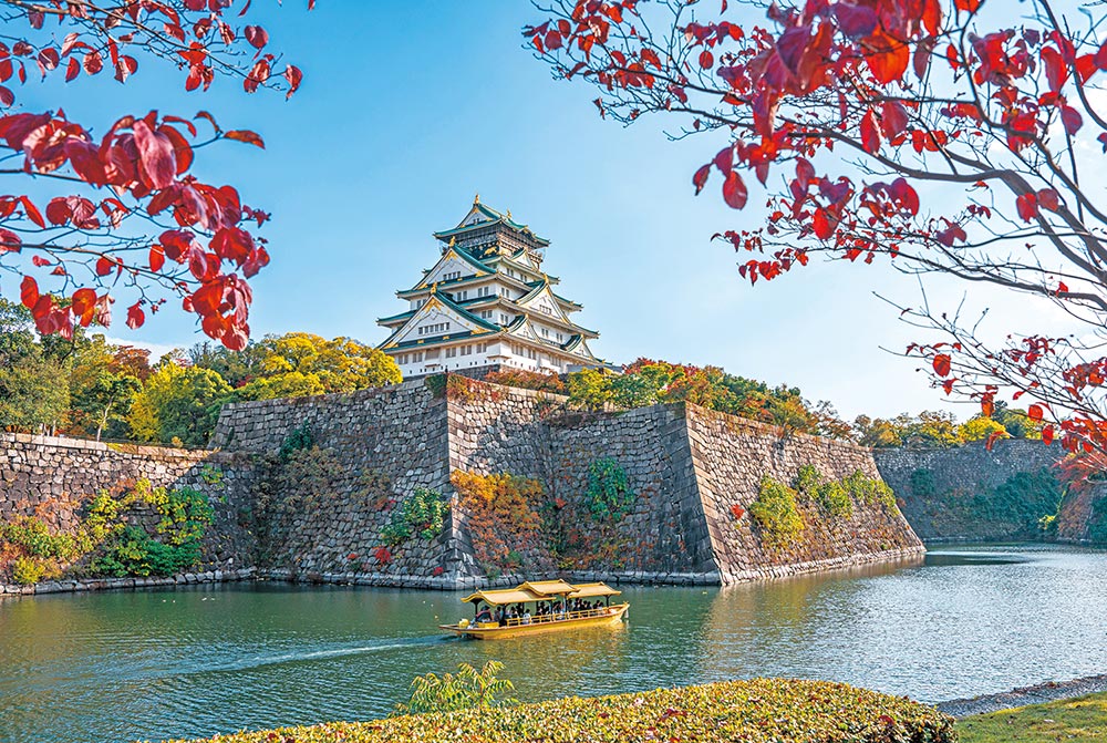 Ao longo do Rio Okawa, que desemboca no corredor de vias fluviais, encontra-se o Parque do Castelo de Osaka. Construída originalmente no século 16, a sua torre central foi reconstruída no século 20 por ter sido destruída em incêndio. Passeios pelo fosso interior em barcos tradicionais de turismo gozabune são muito apreciados. (Foto: PIXTA)