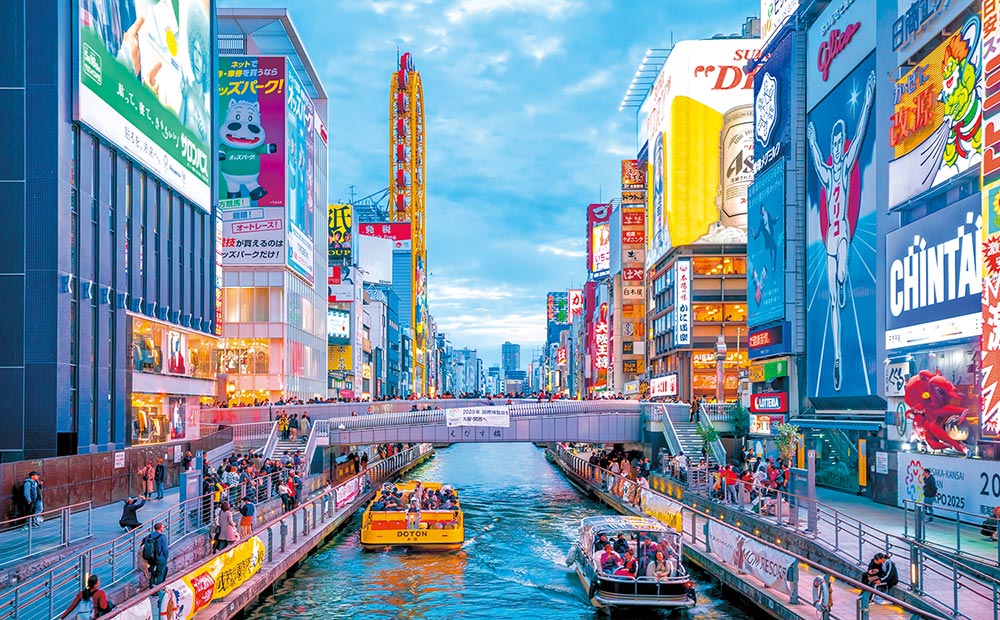 No lado sul do centro da cidade está o canal do Rio Dotonbori, construído no início do século 17. Suas águas passam por várias partes movimentadas do centro, como a área de Namba. Nos últimos anos, foram limpas e foi construído um calçadão, atraindo público crescente. Os frequentadores apreciam a visão dos grandes luminosos, tanto em barcos de turismo como em caminhadas pelo calçadão. (Foto: Shutterstock)