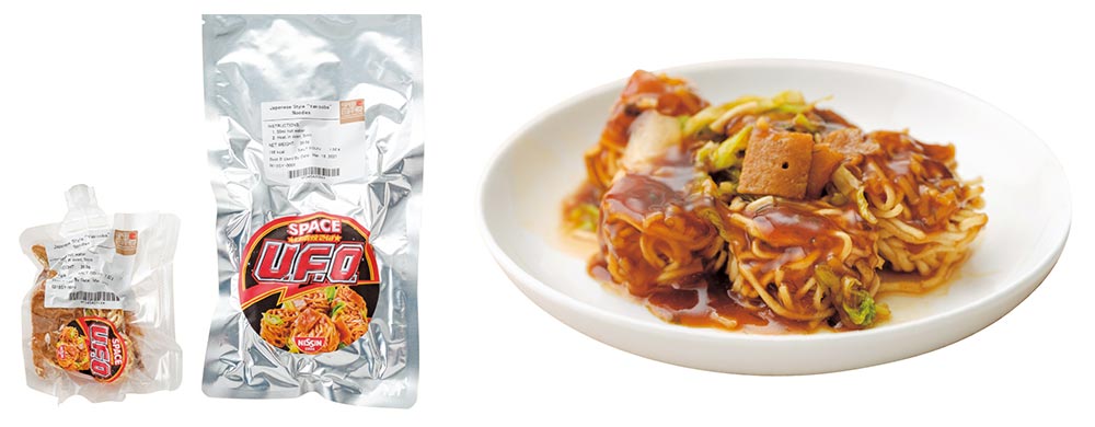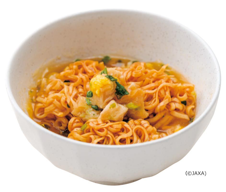 Le fabricant traditionnel de produits alimentaires japonais qui inventa les premières nouilles instantanées au monde en 1958 les a développées pour qu'elles soient faciles à manger même dans un environnement de microgravité avec un bouillon épais et de grosses nouilles qui conservent leur forme même après avoir été réhydratées dans de l’eau chaude. Quant au poulet frit, un classique des konbini (les magasins de proximité japonais), il est lyophilisé et préparé en aliment spatial de façon à conserver le même croustillant si délicieux.