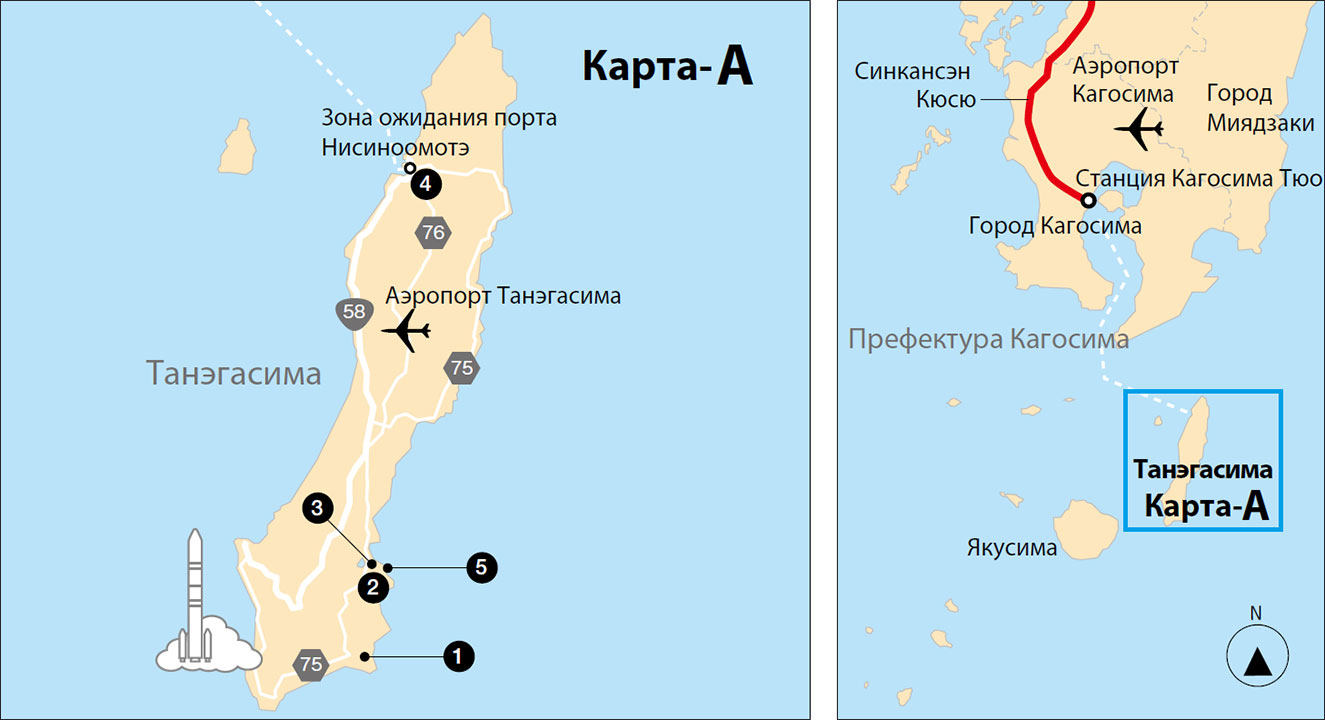 ①Космический центр JAXA Танэгасима②Панорамный парк Эбиноэ③Tanegashima Gelato HOPE④Кондитерская «Сакайя»⑤Пещера Тикура-но Ивая