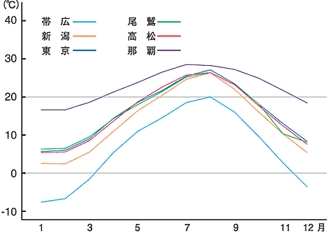 地域の気温差が大きい日本。月によっては、最大25℃近くも差が出るほど気温分布は幅広い。また最近は30℃を超す真夏日も多くなった