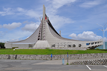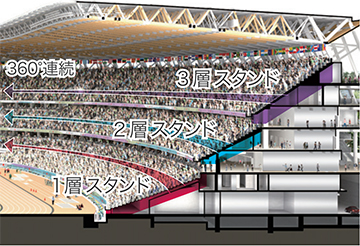 The suspended roof is supported by large, thick cables (Photograph provided by the Japan Sport Council)