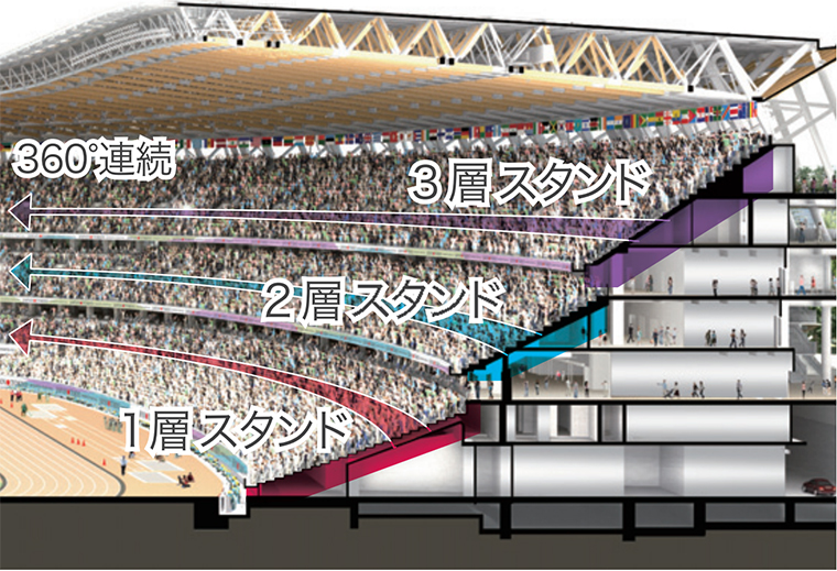 تتمتع اليابان بتاريخ طويل من استخدام الأخشاب كمواد بناء. تم بناء الاستاد الأولمبي من خلال جمع الأخشاب من جميع المحافظات في اليابان واستخدام هذه المواد بفعالية مع الطنوف من أجل خلق توازن متناغم مع المناظر الطبيعية المحيطة. يشجعك هذا التصميم على تقدير الطبيعة الكريمة وثقافة الشعب الياباني الذي يولي أهمية كبيرة للطبيعة والرغبة في التعايش مع العالم الطبيعي.