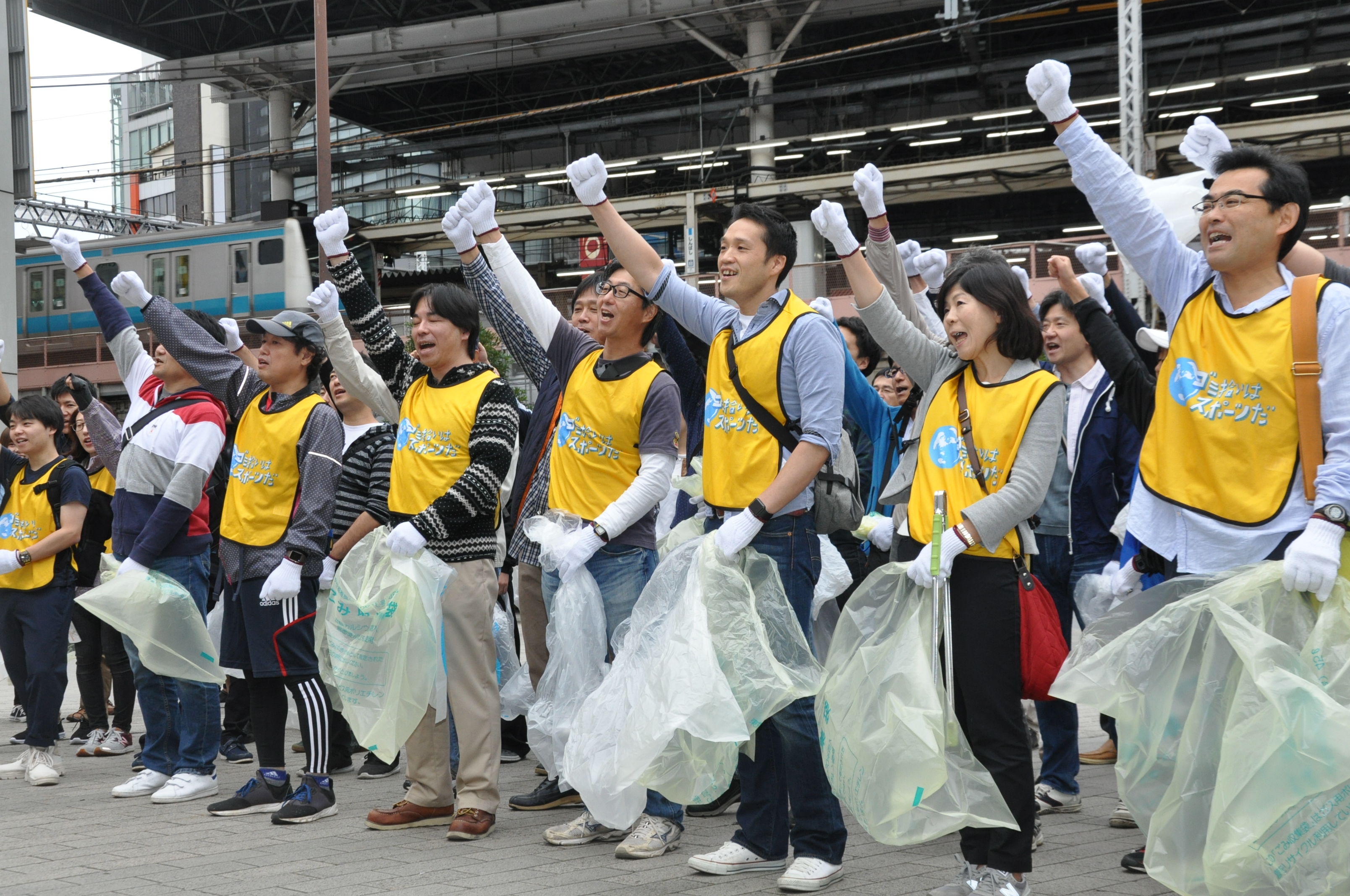 Los participantes gritan "¡Recoger la basura es un deporte!" para levantar su ánimo en un“Concurso Spo-Gomi”llevado a cabo en el distrito Minato de Tokio, el 13 de octubre de 2018, frente a la Estación JR Shinbashi